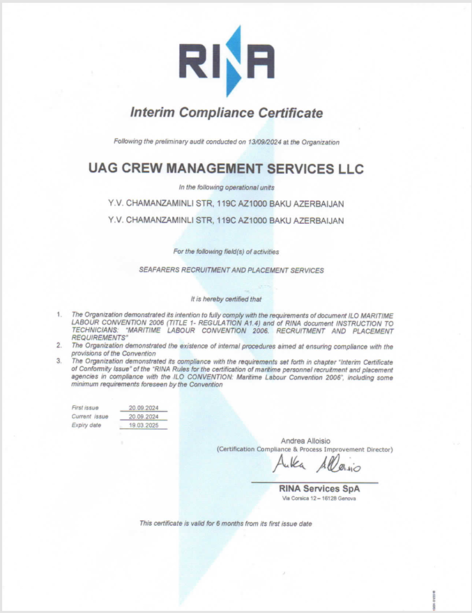 At UAGCrew, our work revolves around the meticulous orchestration of crew management for vessels in the Maritime, Oil, and Gas sectors. Guided by the principles of ISO certification and MLC 2006 compliance, our comprehensive approach encompasses sourcing, recruitment, deployment, and ongoing management of skilled seafarers. We prioritize crew training and upgrading programs, ensuring a workforce that aligns seamlessly with your vessel's needs.